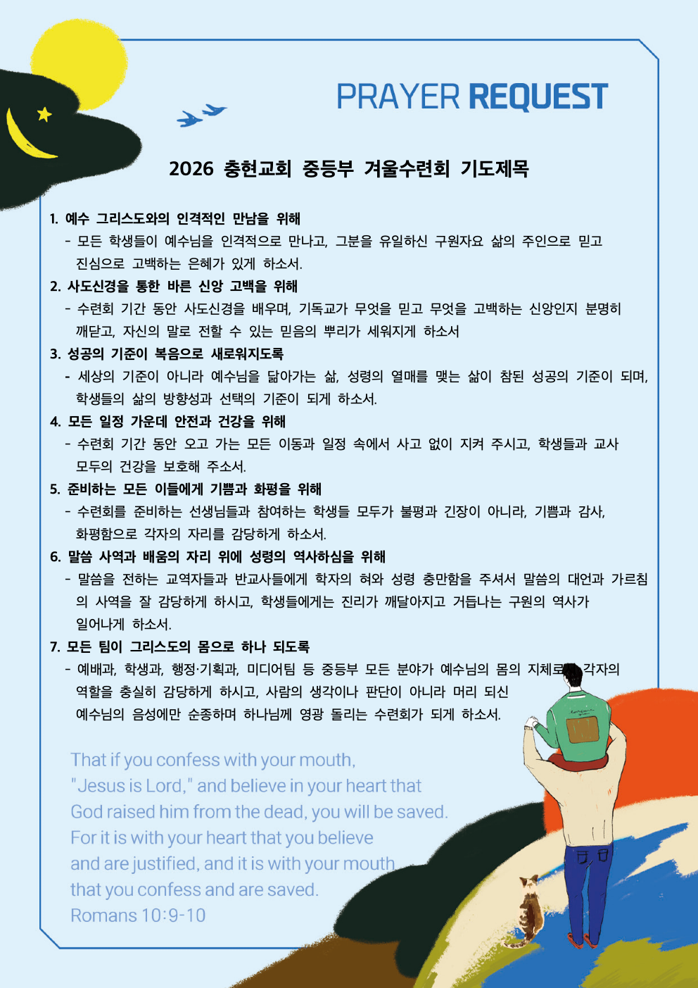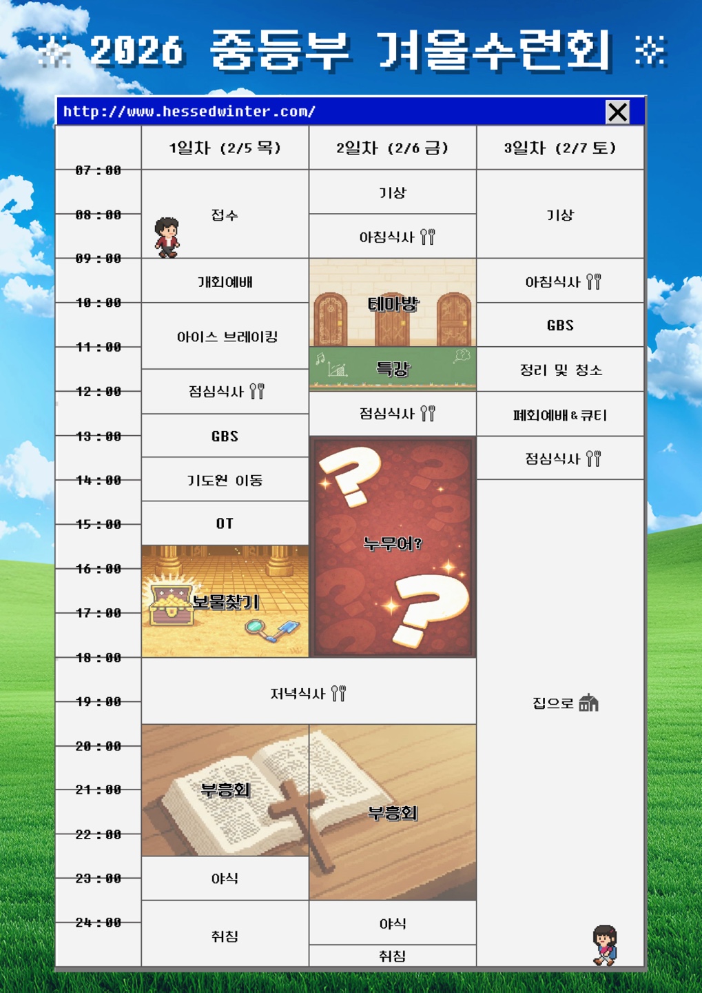 - 새가족은 회비가없습니다(전도위함). 식수/취침 인원 파악을 위해 연락만 먼저 해주시면 감사하겠습니다.