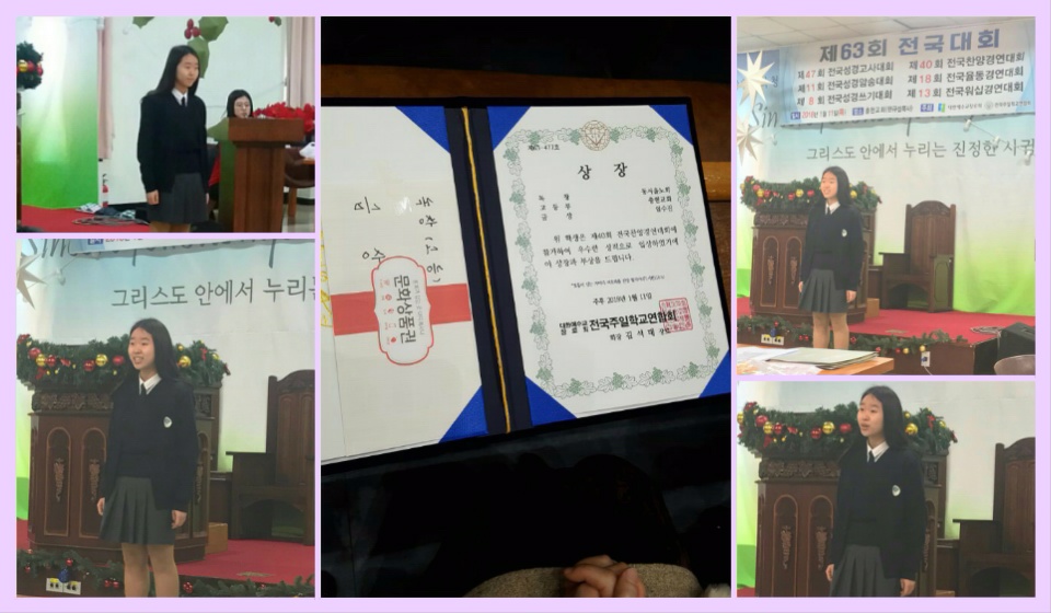 고등부에서는 독창, 중창부분에 참가하였는데, 중창팀은 당일에 못나온 학생들도 있어서, 아쉽게 수상은 못 하였습니다.하지만, 독창 부문에서 3학년되는 임수진 학생이 금상을 받았습니다..최선을 다한 학생들과 수고해 주시고 기도로 함께 해 주신 선생님들께 깊은 감사를 드립니다. 아울러 저희 교회가 속한 동서울 노회가 찬양,율동 부분에서 종합 성적 2위라는 성적도 올려 함께 축하하고 감사하는 시간이 되었음합니다..독창은 지정곡과 중창팀은 자유곡을 동영상도 함께 업로드 하도록 하겠습니다. 은혜로운 시간 되세요`~^^