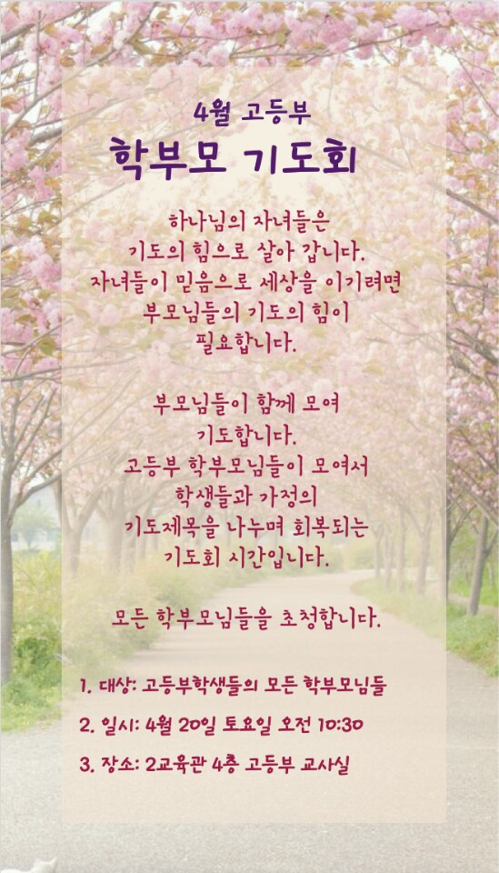 고등부에서는 매월 3째주 토요일에 학부모를 초청하여 자녀들을 위해 교역자와 함께 기도회를 가집니다~고등학생을 두신 학부모님들은 모두 대상이 되니 마니 참석하셔서 자녀들을 위해 함께 기도해요~^^