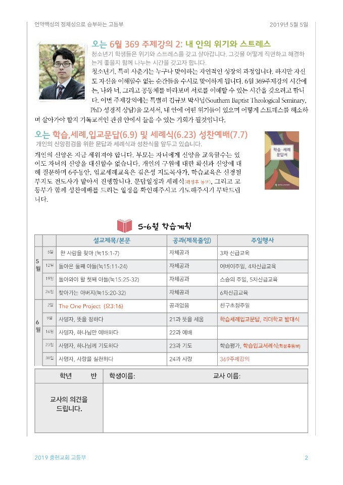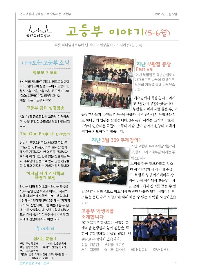 고등부에서는 두달에 한번씩 목사님께서 학부모님에게 보내는 고등부 소식지가 있습니다~5.6월달 소식지이니 읽으시면서 고등부의 지난 두달간의 소식을 알아보아요~^^
